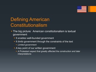 The document discusses the key aspects of American constitutionalism, including that it is based on written texts that enable government while also limiting it. It outlines several important founding documents and thinkers that influenced the American system. The document also examines the Declaration of Independence and how it expressed the colonists' grievances against King George III, as well as the rise of republicanism and weak central government under the Articles of Confederation.