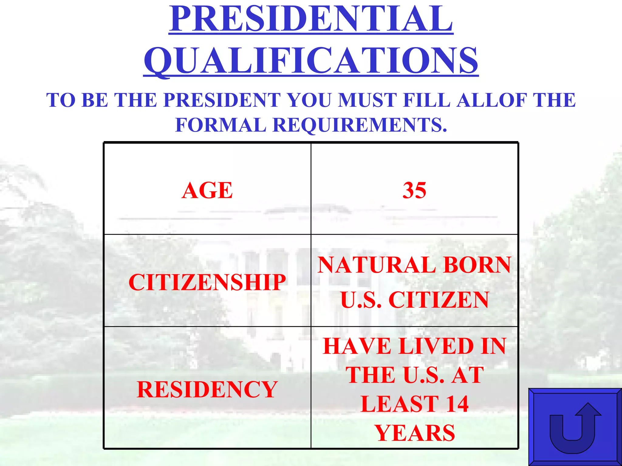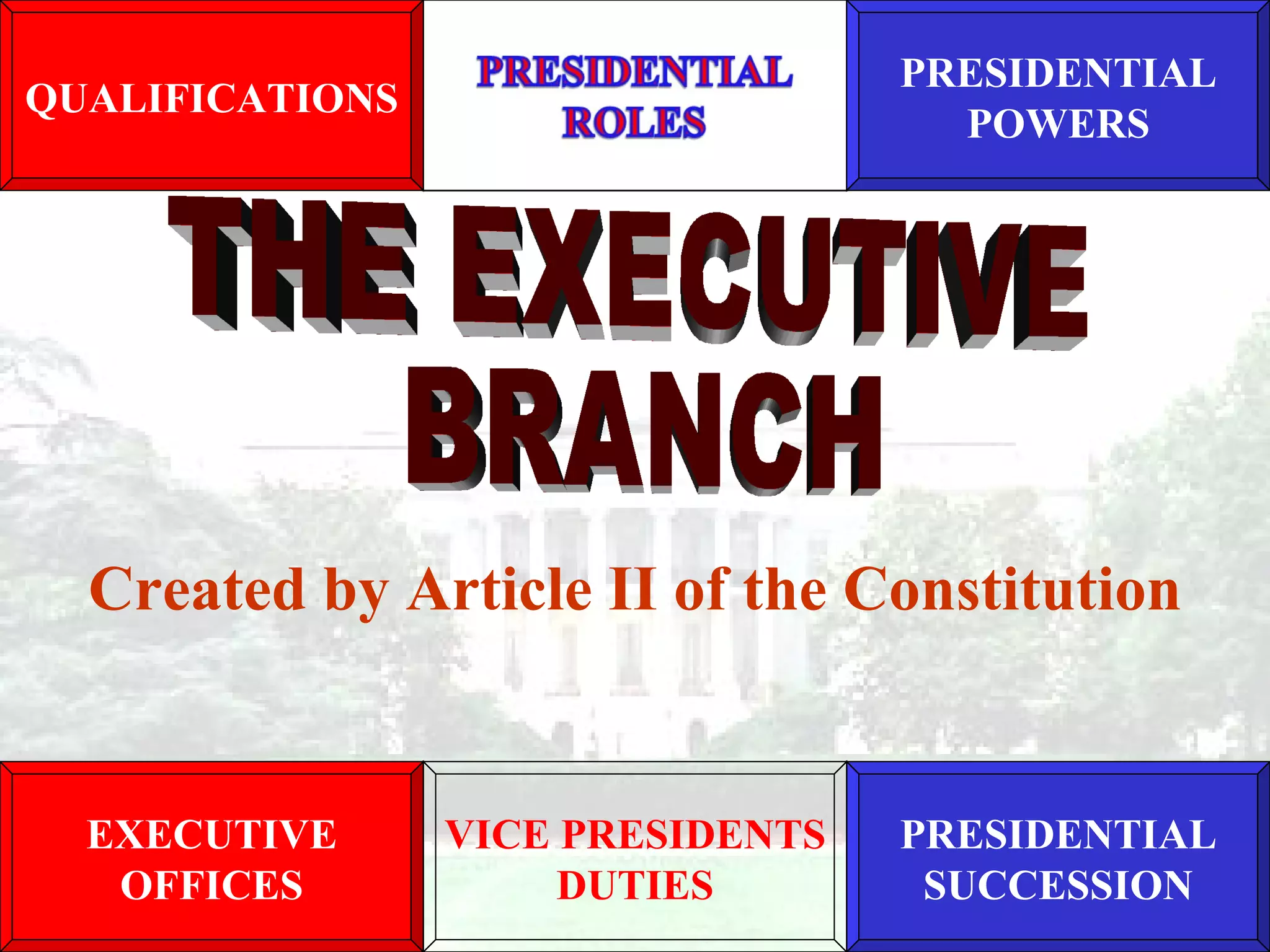 The document outlines the qualifications, powers, and roles of the President of the United States. It discusses the President's executive powers such as executing laws, appointing officials, and issuing executive orders. It also covers diplomatic powers like making treaties and recognizing foreign governments. The roles of the President include chief executive, chief diplomat, commander-in-chief, and chief legislator. Key executive offices that support the President are also summarized.