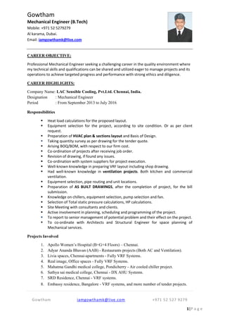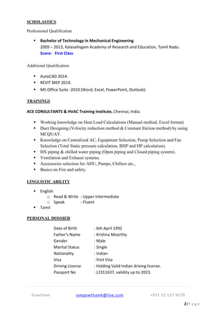 Gowtham provides his resume detailing his objective to find a challenging career as a mechanical engineer, highlighting his 3 years of experience designing HVAC systems and managing projects at LAC Sensible Cooling, and listing his educational background as a Bachelor of Technology in Mechanical Engineering from Kalasalingam Academy of Research and Education.