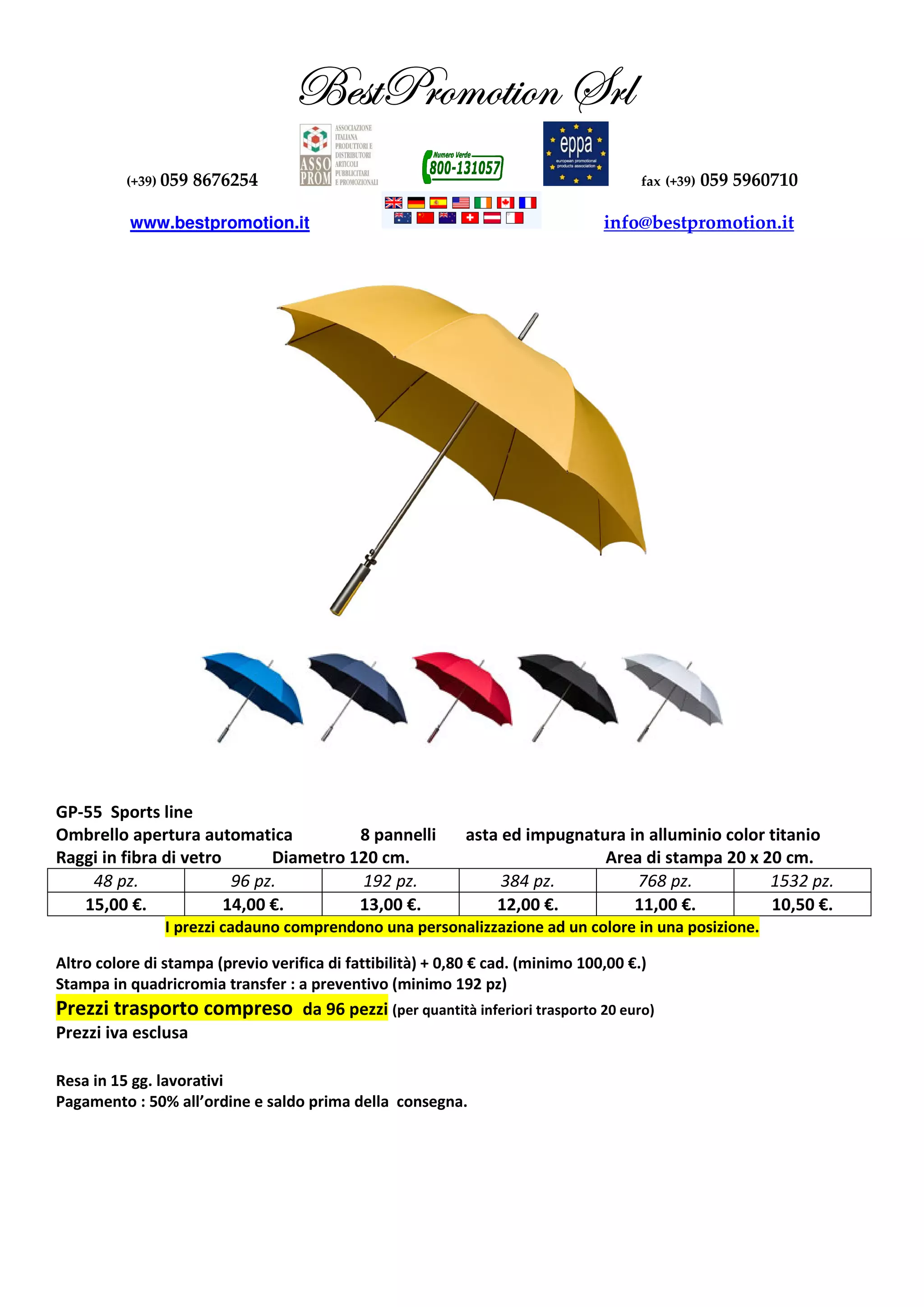 Il documento descrive le specifiche e i prezzi di un ombrello automatizzato con 8 pannelli e impugnatura in alluminio, disponibile in diverse quantità. I prezzi variano a seconda della quantità ordinata e includono una personalizzazione ad un colore. I termini di pagamento prevedono un acconto del 50% all’ordine e il saldo prima della consegna.