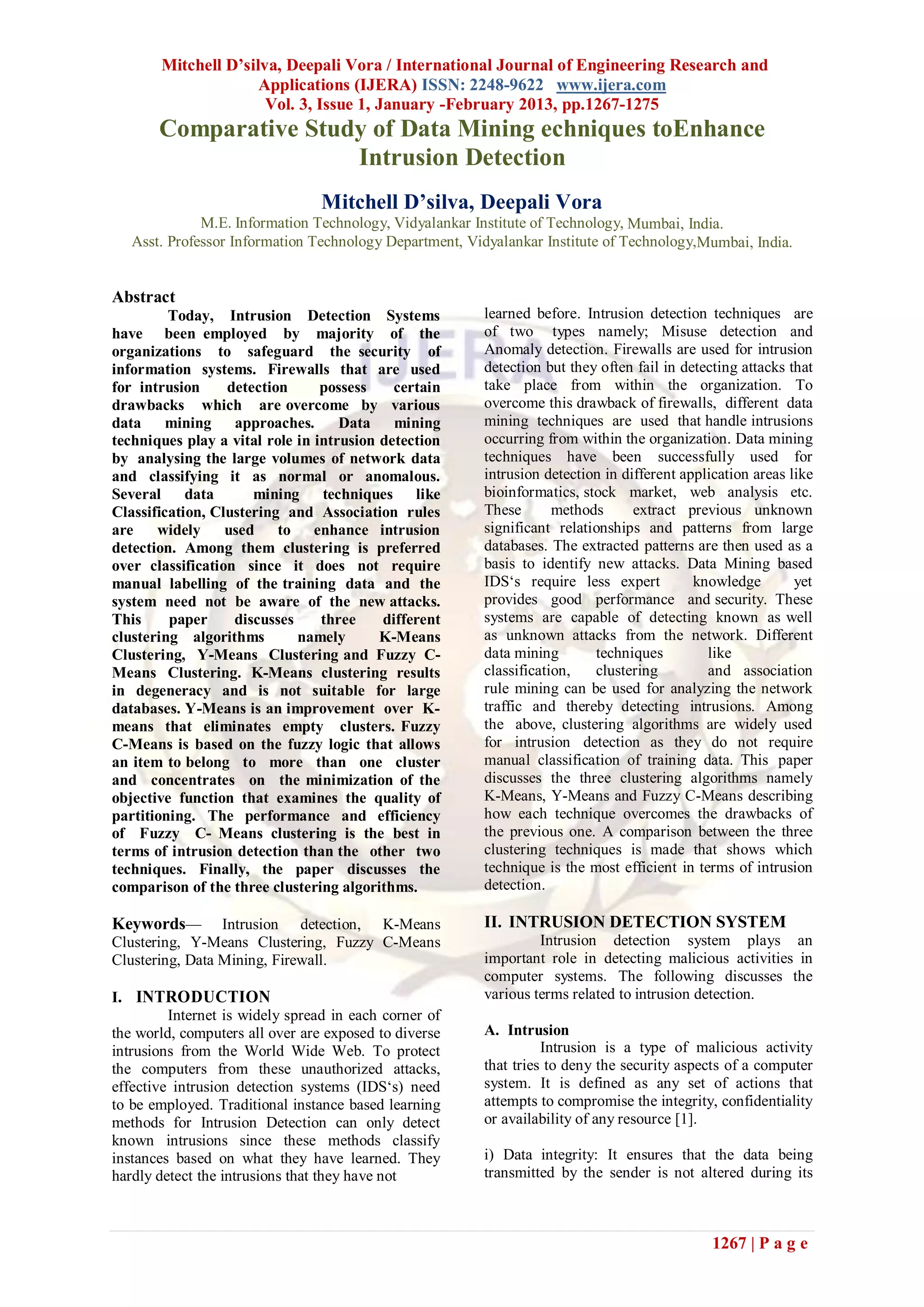 The document presents a comparative study of data mining techniques to enhance intrusion detection systems (IDS). It discusses various clustering algorithms like k-means, y-means, and fuzzy c-means, highlighting their strengths and weaknesses in detecting known and unknown attacks. The paper concludes that clustering techniques, particularly fuzzy c-means, are more effective than traditional classification methods as they do not require manual data labeling and can identify new types of intrusions.