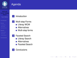 This document discusses multi-step forms and faceted search capabilities for Liferay. It describes existing Liferay functionality for forms and search, and then introduces portlets created to add multi-step forms and faceted search features. These portlets integrate with Liferay to provide enhanced customizable forms and search based on categories while extending rather than replacing core Liferay features. The portlets are demonstrated and areas for further improvement are noted.