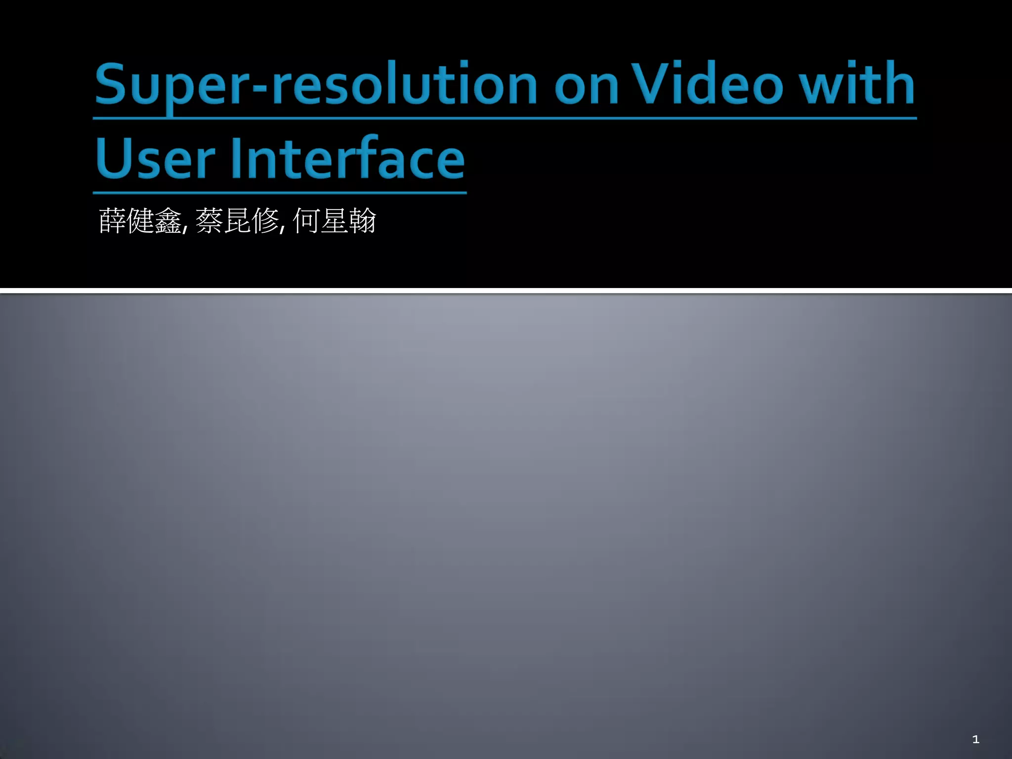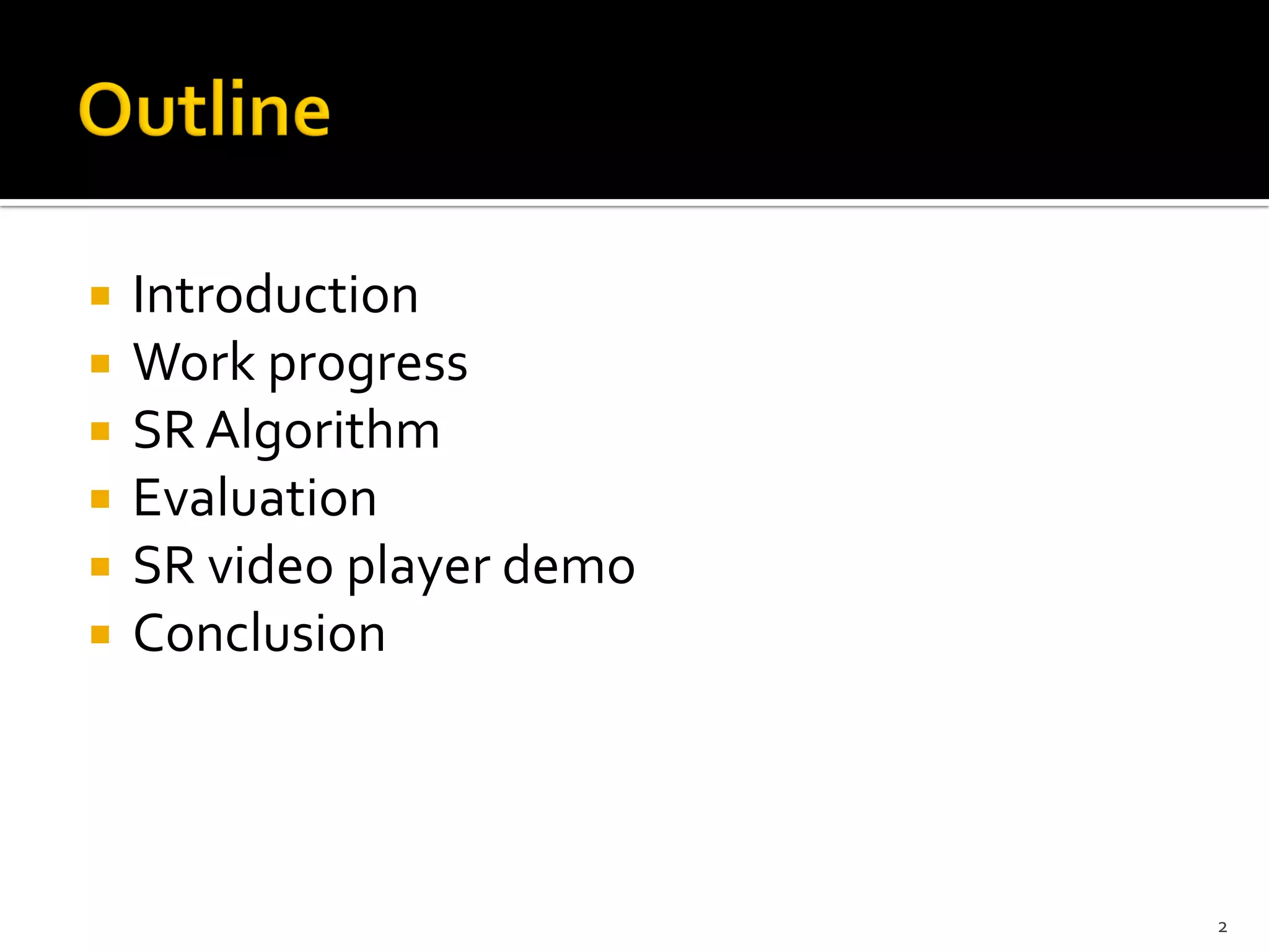 This document summarizes work on video super-resolution techniques. It introduces two algorithms: FGSR, a fast general super-resolution method; and FRSR, a slower but higher quality method for translational motion. It evaluates the algorithms on test video, finding that FRSR achieves higher PSNR scores than FGSR or bilinear interpolation. Overall processing speed is improved with a GPU implementation. The conclusion discusses open challenges in optical flow, occlusion handling, and utilizing more frame information.