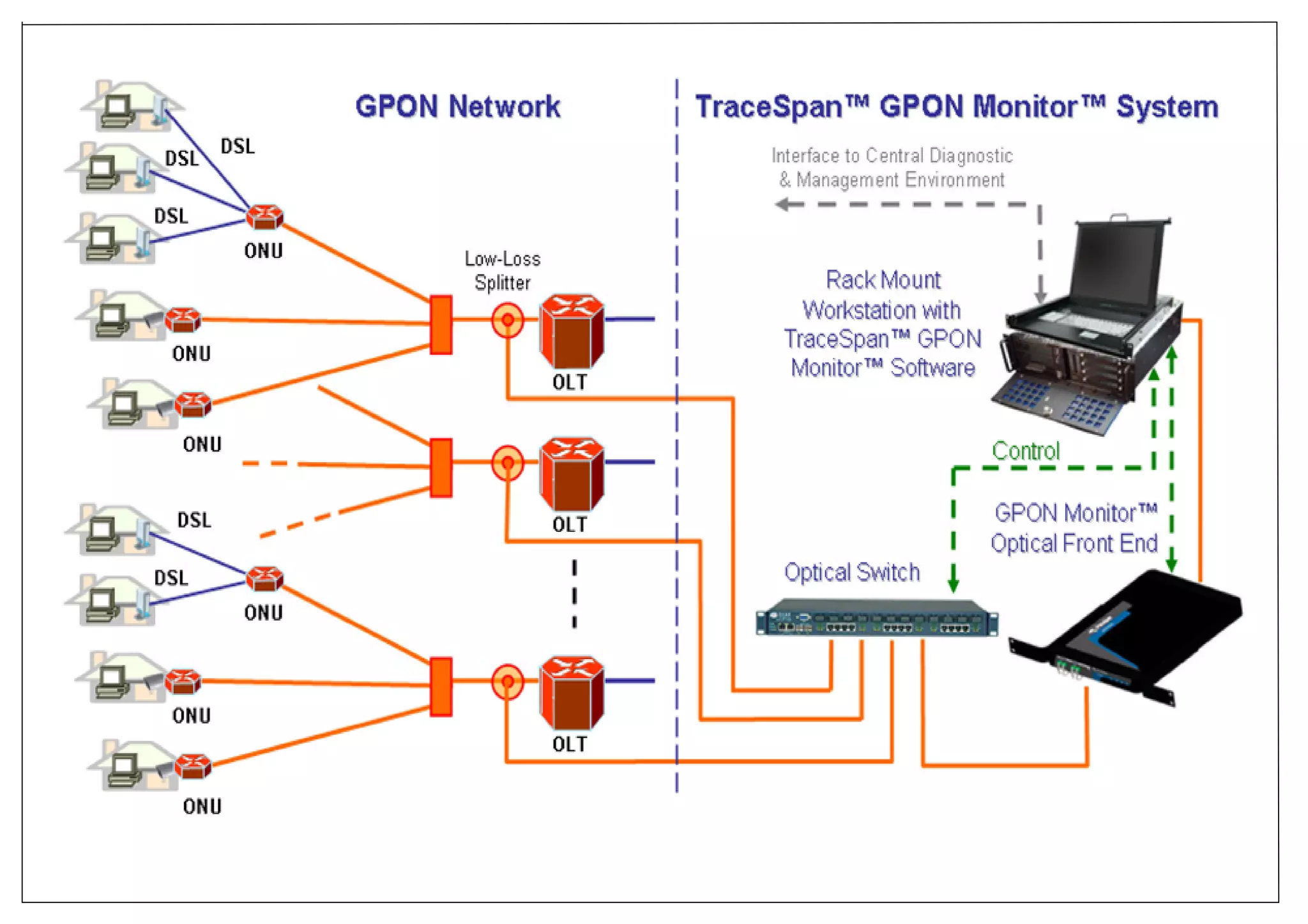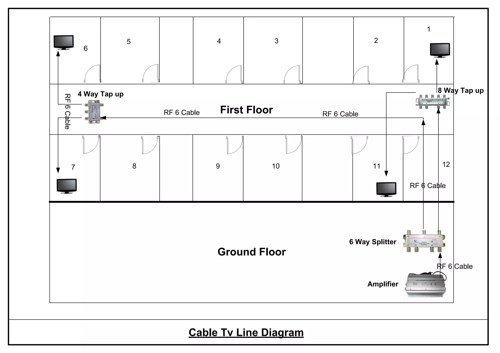 This diagram shows a cable TV network setup with an 8-way tap at the top connecting to the first floor, a 4-way tap connecting to the second floor, and a 6-way splitter connecting to the ground floor, with RF6 cables running throughout and an amplifier boosting the signal.