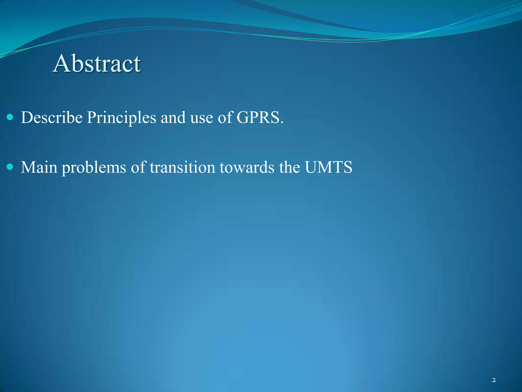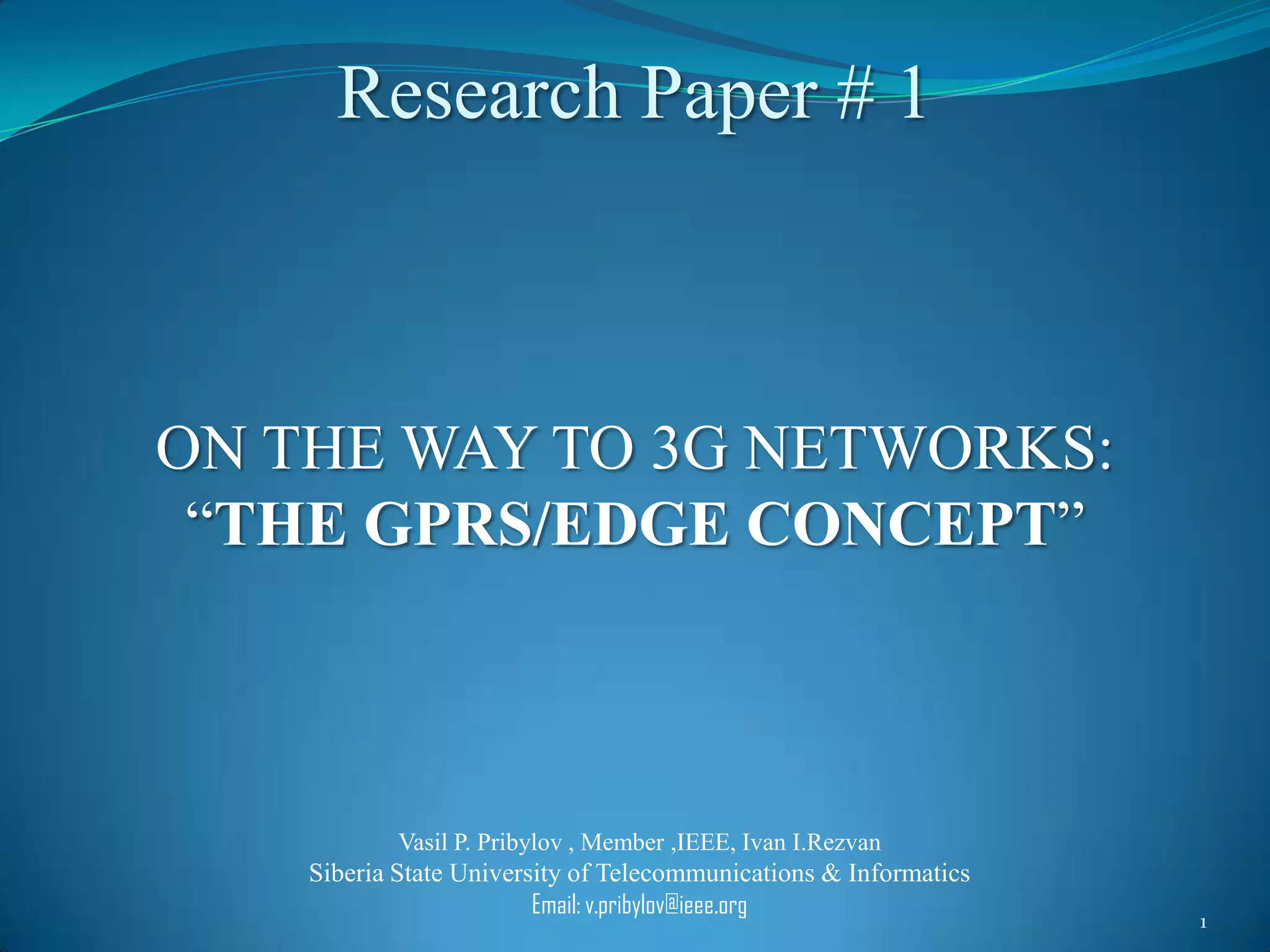 This research paper summarizes the principles and use of GPRS (General Packet Radio Service) as a 2.5G mobile data system and transition technology towards 3G networks. It describes how GPRS allows packet data transmission within existing 2G GSM infrastructure at moderate bit rates. It also discusses GPRS limitations and security aspects. Finally, it introduces EDGE as an enhanced version of GPRS that achieves higher speeds and concludes that GPRS/EDGE serves as an important transition technique towards 3G networks like UMTS since existing GSM infrastructure can be reused.