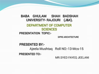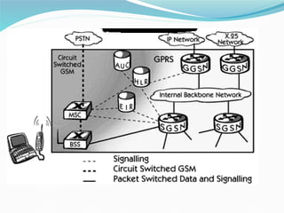 GPRS is a packet-based mobile data service that extends GSM capabilities to provide Internet access and other data services. It requires modifications to GSM network elements including new mobile stations, a packet control unit added to base station controllers, and new GPRS support nodes. The GPRS architecture introduces a serving GPRS support node and gateway GPRS support node that interface with the internal IP-based backbone network to route data traffic through the correct nodes. Routing areas, which are smaller than GSM location areas, help optimize the routing of data packets.