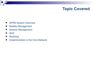The document discusses GPRS and UMTS networks in the core network. It covers topics like GPRS system overview, mobility management, session management, quality of service, and roaming implementation in the core network. It describes the functions of core network elements like the SGSN and GGSN, including mobility management, session management, payload handling, charging, quality of service, and security. It also discusses access point names (APNs) and how quality of service is implemented in GPRS and UMTS networks.