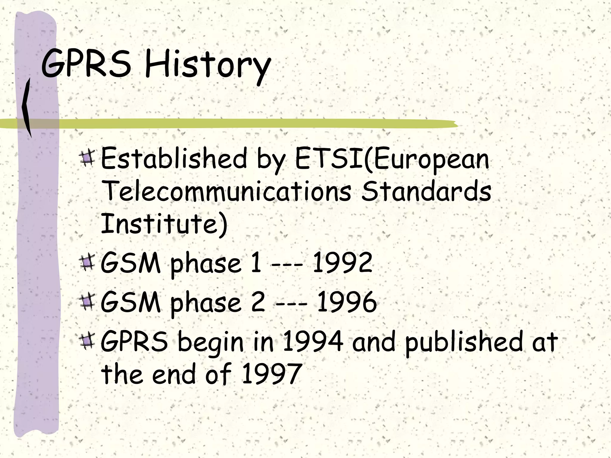 GPRS was established by ETSI to provide packet-switched data services in GSM networks. It introduces two new core network nodes, SGSN and GGSN, to route packets between external data networks and mobile stations. GPRS supports bit rates up to 170kbps and quality of service features. It allows dynamic allocation of radio resources and efficient delivery of packet data using concepts like always-on connectivity and burst transmissions. GPRS uses concepts like point-to-point and point-to-multipoint connections to provide services like IP, X.25, SMS and other applications to mobile users.