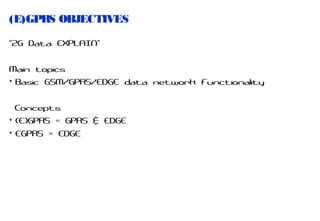 (e)GPRS basics provides an overview of the GPRS and EDGE systems, detailing network functionality, architecture, and the modulation techniques involved. It covers various topics including session management, mobility management, and GPRS attach/detach procedures, while outlining the hardware and software requirements for implementation. The document also explains coding schemes, network interfaces, and key components of the (e)GPRS system architecture.