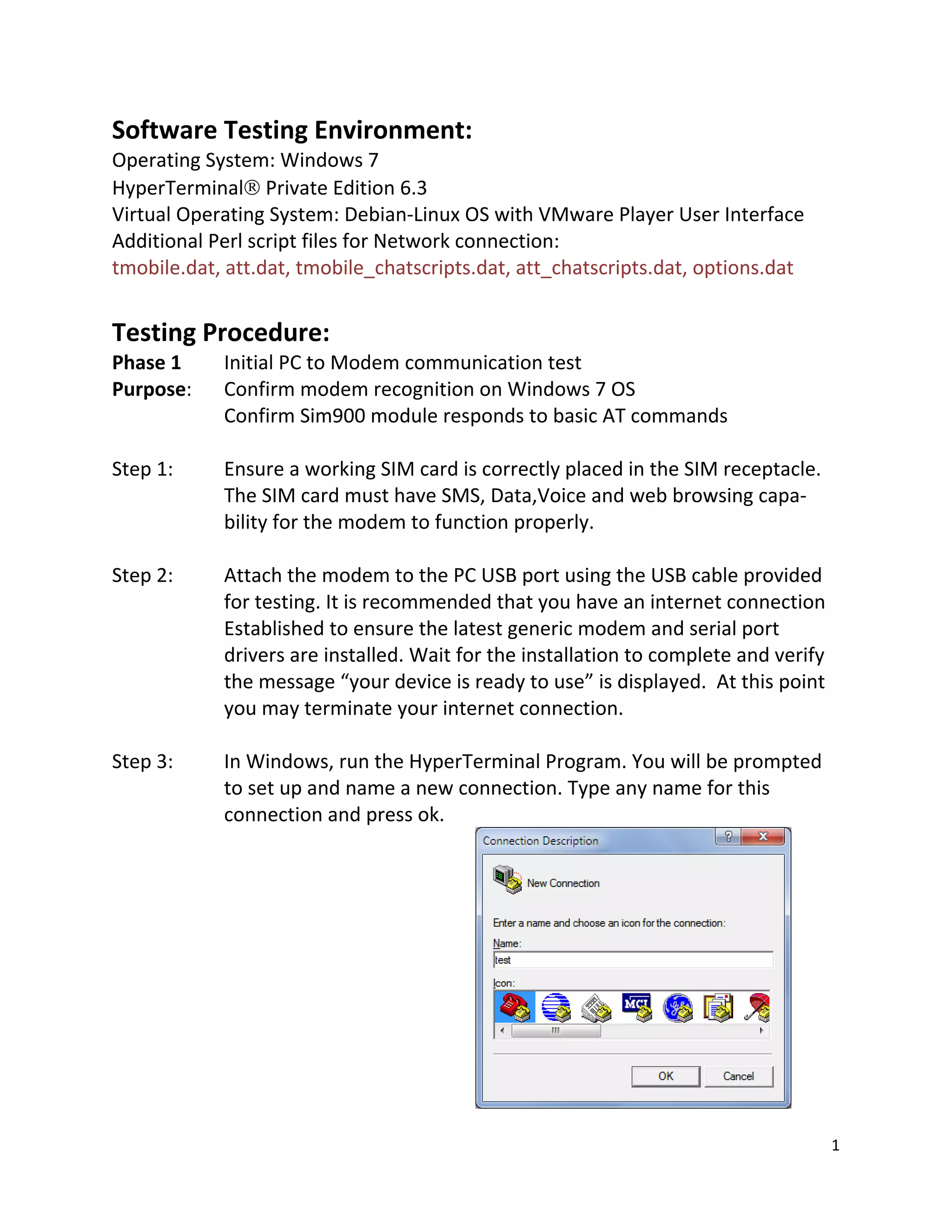 This document outlines the testing procedure for a USB GPRS modem on Windows and Linux operating systems. It involves 4 phases: