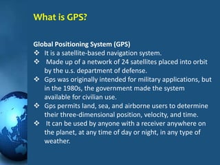 The GPS consists of 3 segments - the space segment of 24 satellites orbiting Earth, the control segment of ground stations monitoring the satellites, and the user segment of GPS receivers. GPS satellites continuously transmit radio signals allowing receivers to calculate their location on Earth by triangulating signals from at least 3 satellites. Originally intended for military use, GPS is now widely used for civilian navigation in vehicles, hiking, boating and more.