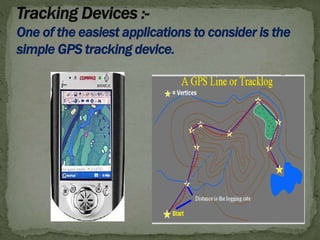 The document discusses many applications of GPS technology across several domains. It begins by covering general applications and then discusses uses in engineering like 3D modeling, geodesy, geophysics, geology, geodynamics and GIS. It also outlines innovative applications like tracking wildlife, GPS aides for the blind, and GPS uses in emergency systems. The document provides examples of GPS applications in areas like navigation, aviation, mining, transportation and more.