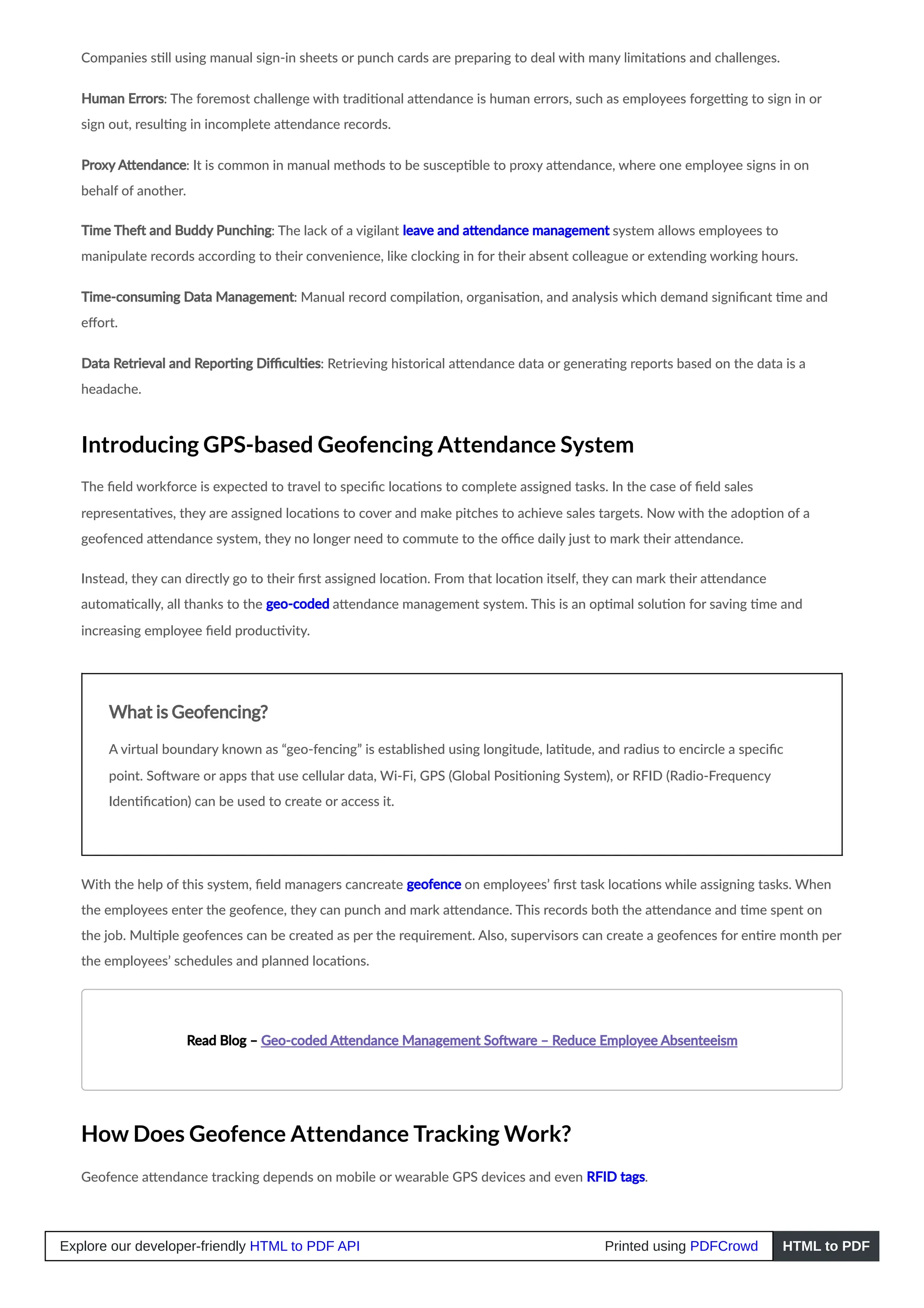 The document discusses a GPS-based geofencing attendance system aimed at improving employee tracking and attendance management for businesses. It outlines the challenges of traditional manual attendance methods, such as human errors and time theft, and argues that geofencing can automate attendance marking while enhancing productivity and accountability. Key features of the system include real-time location tracking, customizable geofences, and integration with existing HR systems, ultimately leading to cost savings and increased employee satisfaction.