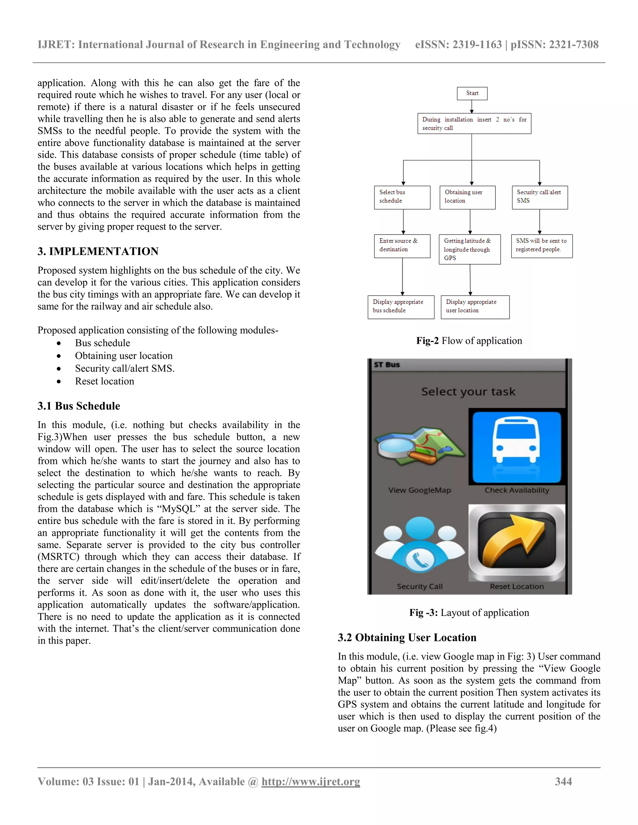 The document describes a GPS-enabled Android application designed to provide bus schedule information for users in Nasik city, allowing them to access bus timings and fares by inputting their source and destination. The application features GPS functionality to display the user's location and includes a security alert function to notify contacts in case of emergencies. It emphasizes ease of use and integration with the Android platform, aiming to improve public transportation experience and user safety.