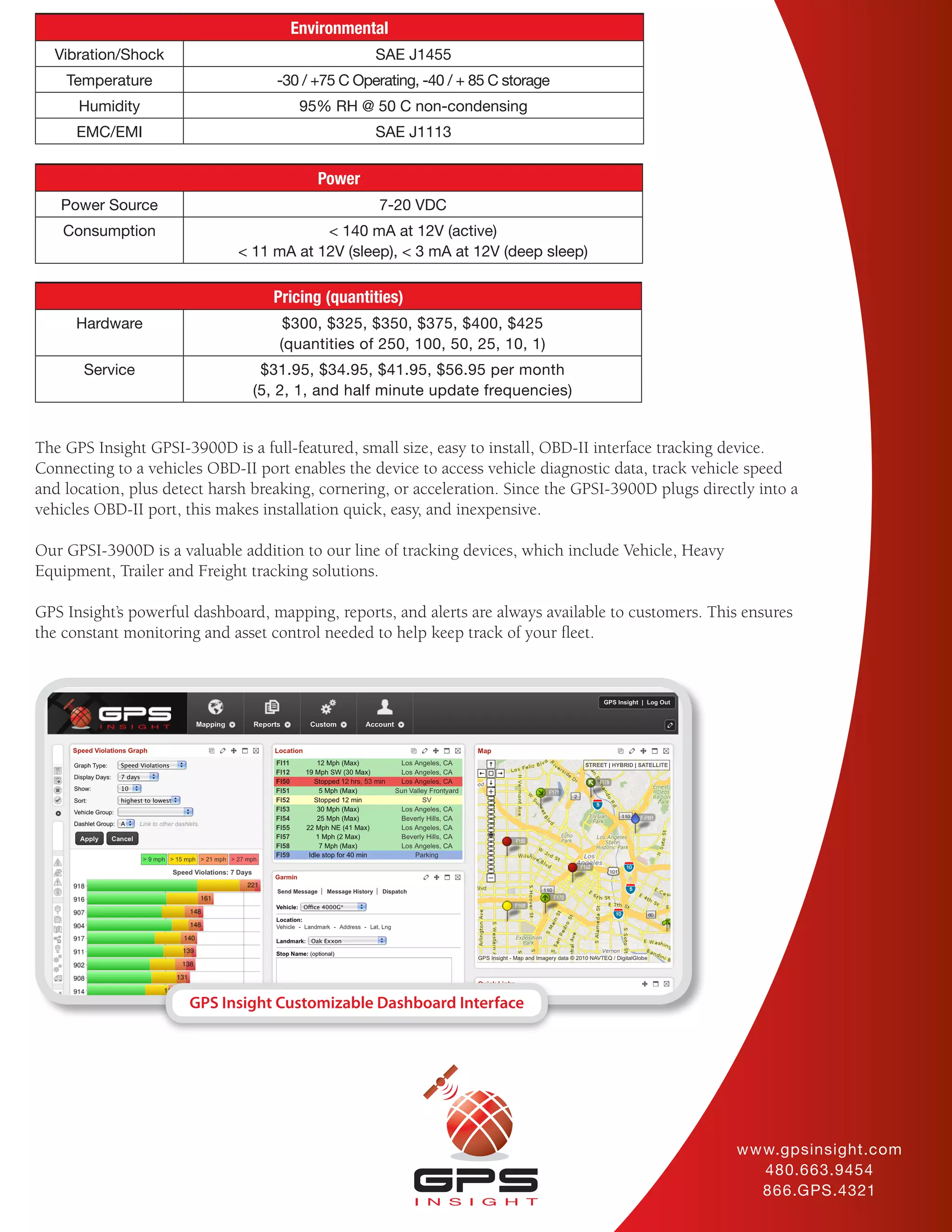 The GPSI-3900D is a small, easy to install vehicle tracking device that connects to the OBD-II port for access to diagnostic data and vehicle location tracking. It has built-in GPS and cellular antennas for a simple installation. The device tracks location, speed, driver behavior and detects impacts. GPS Insight provides customizable dashboard interfaces and reports for fleet monitoring and asset control.