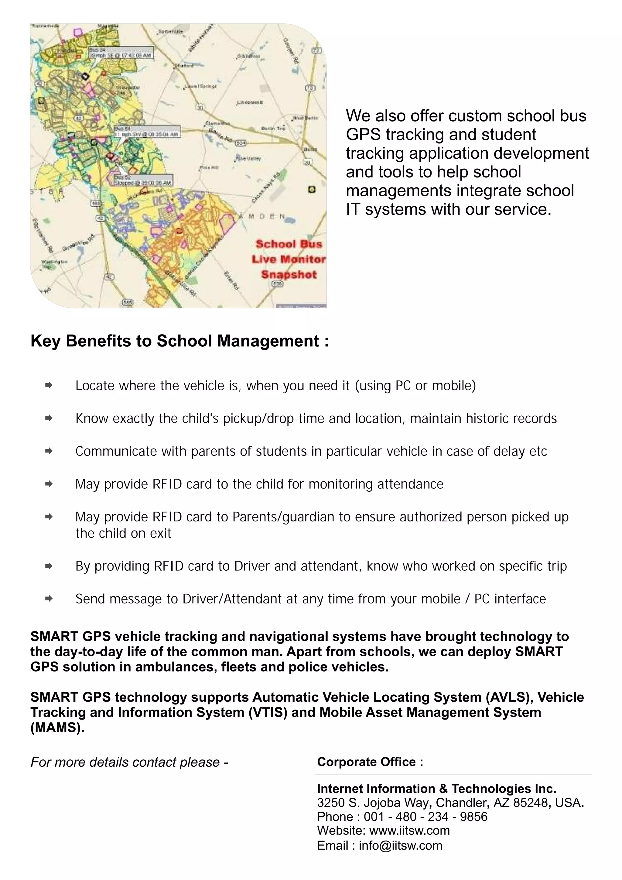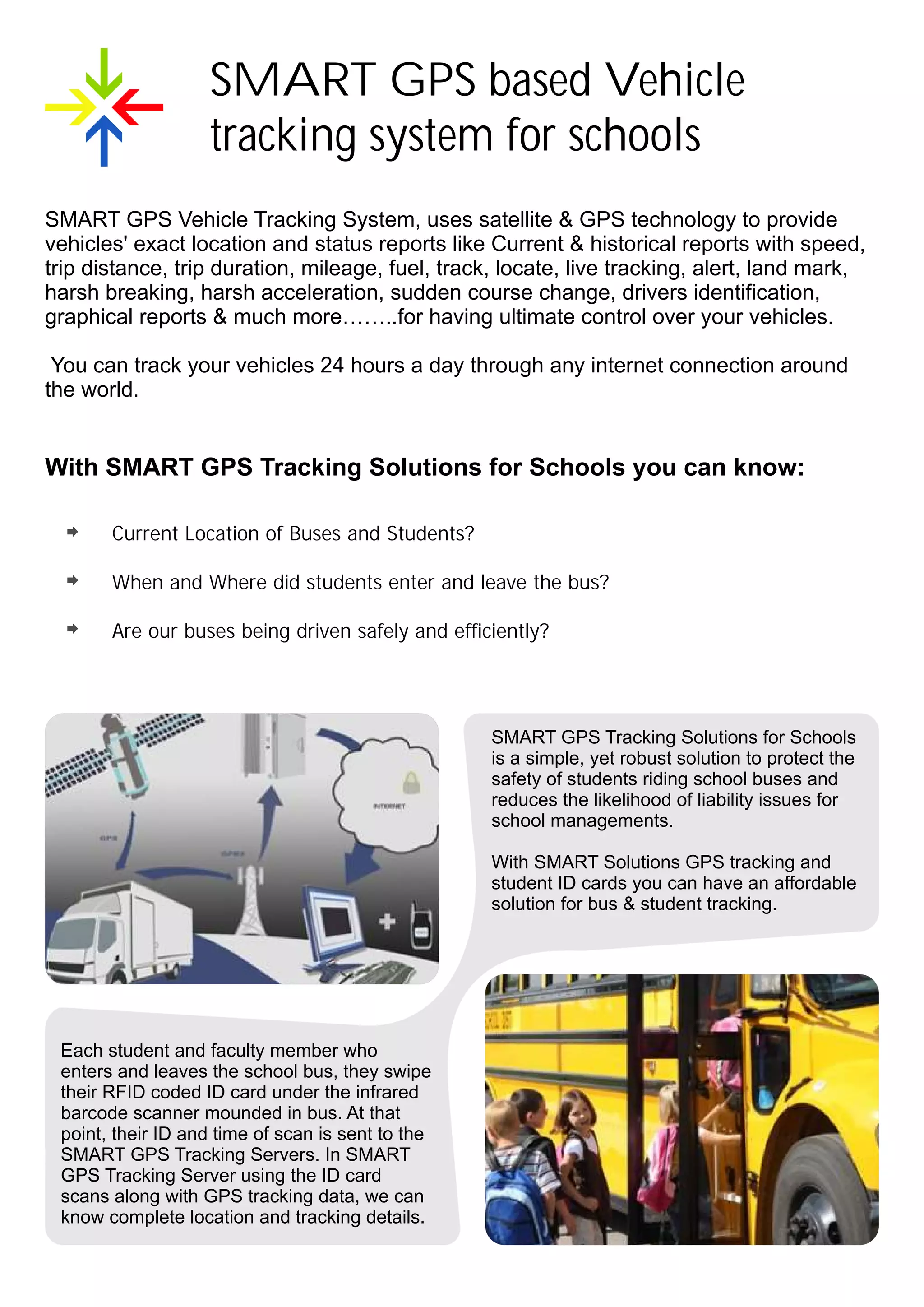 The document describes a GPS-based vehicle tracking system for schools called SMART GPS Tracking Solutions. The system uses GPS technology and RFID cards to track the location and movement of school buses and students. It allows schools to monitor the current location of buses, track when and where students enter and exit buses, and ensure buses are being driven safely. The system provides safety and accountability benefits to school management.