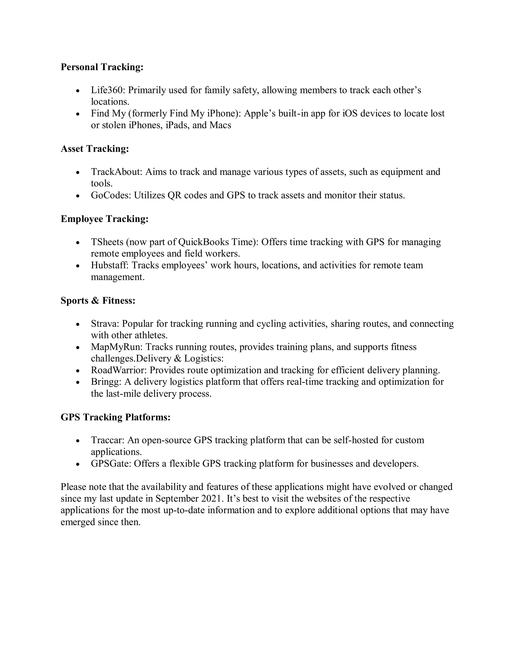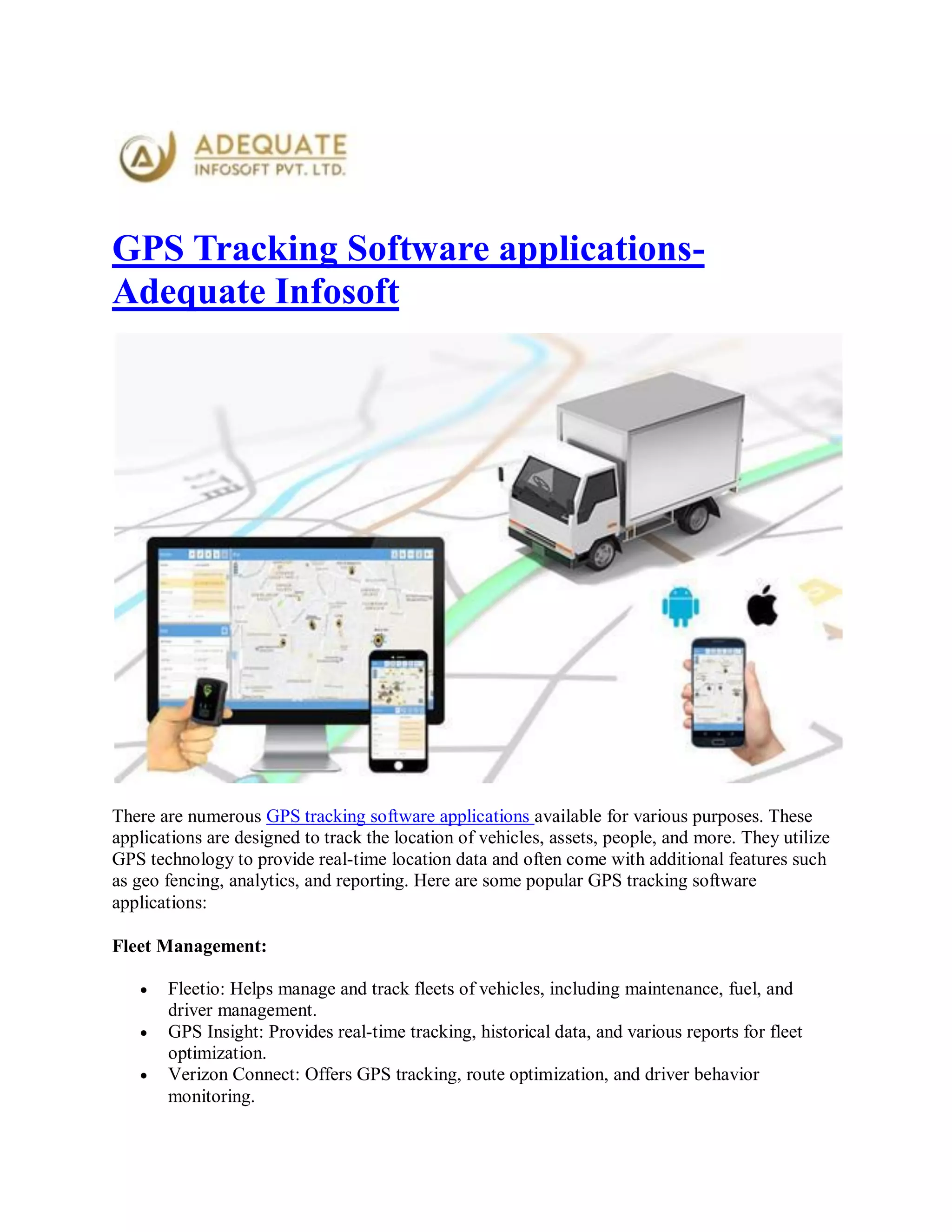 There are many GPS tracking software applications available for various uses such as fleet management, personal tracking, asset tracking, employee tracking, sports/fitness, delivery/logistics, and custom GPS tracking platforms. They utilize GPS technology to provide real-time location data and often include additional features like geo-fencing, analytics, and reporting. Popular applications include Fleetio, GPS Insight, and Verizon Connect for fleet management; Life360 and Find My for personal tracking; TrackAbout and GoCodes for asset tracking; and TSheets, Hubstaff, Strava, and MapMyRun for other common uses.