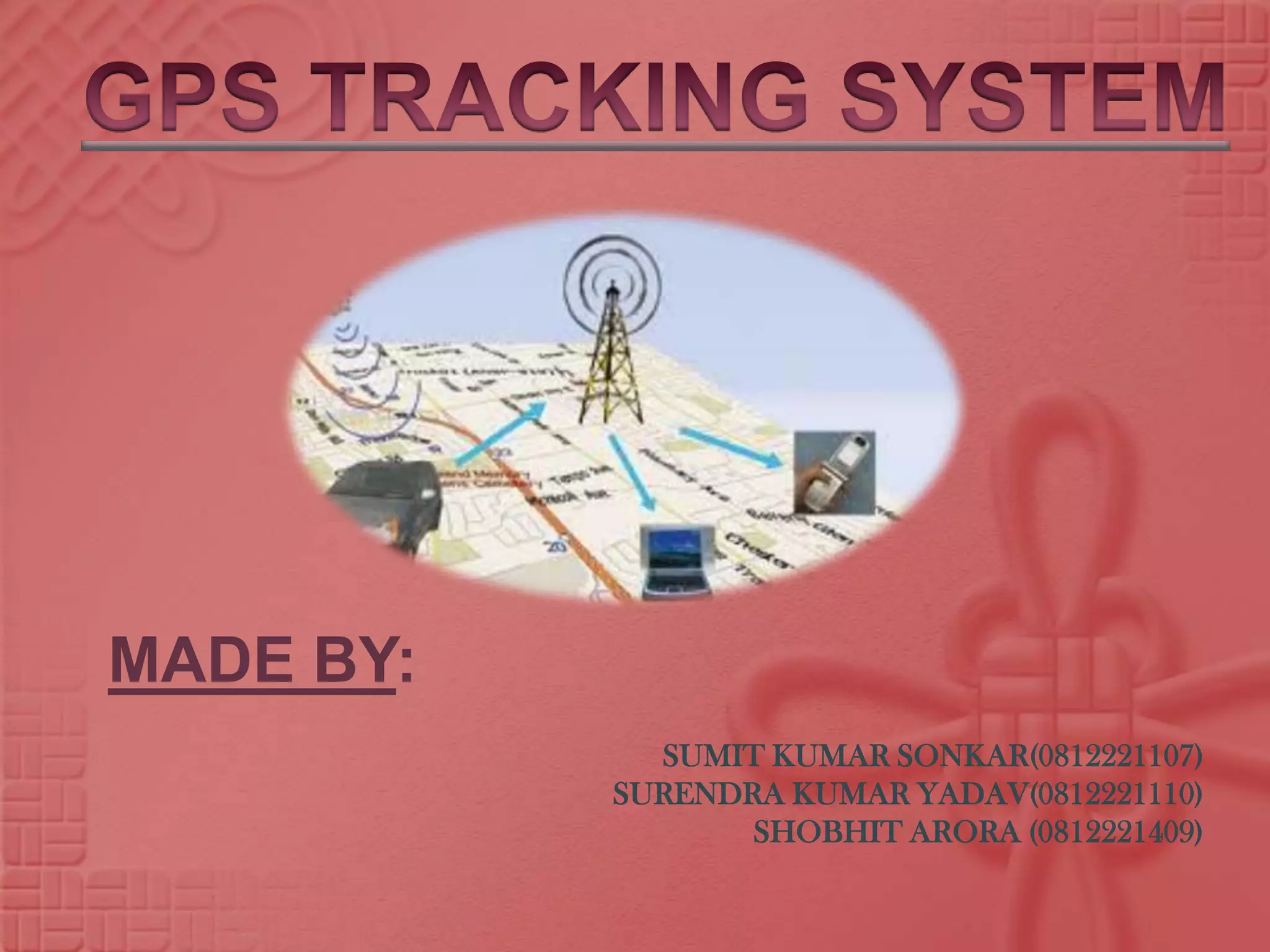 The document describes a GPS tracking system that uses GPS technology to determine the precise location of assets. It explains that a GPS tracking unit attaches to an asset and records its position at regular intervals, storing or transmitting the location data. This allows the asset's location to be viewed in real time or analyzed later on a map using tracking software. The document also provides background on GPS technology and its origins for defense purposes using satellite navigation. It describes the components used in a sample GPS tracking system including microcontrollers, GPS modules, resistors, capacitors and LCDs.