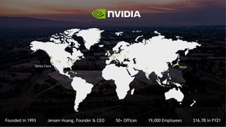 The document discusses NVIDIA data center GPUs such as the A100, A30, A40, and A10 and their performance capabilities. It provides examples of GPU accelerated application performance showing simulations in Simulia CST Studio, Altair CFD, and Rocky DEM achieving excellent speedups on GPUs. It also discusses Paraview visualization being accelerated with NVIDIA OptiX ray tracing, further sped up using RT cores. Looking ahead, the document outlines NVIDIA Grace CPUs which are designed to improve memory bandwidth between CPUs and GPUs for giant AI and HPC models.