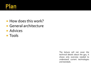 The document outlines an overview of GPU architecture and processing techniques, emphasizing the evolution from fixed vertex and fragment units to unified architectures that allow flexible processing. It discusses various computing models such as SISD, SIMD, and MIMD, and highlights the potential of GPUs for general-purpose computing across diverse fields including physics, financial modeling, and AI. Additionally, it provides optimization tips for programming on GPUs and references tools for debugging and performance analysis.