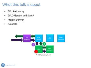 The document discusses GPU Direct RDMA and its relevance to green multi-GPU architectures, emphasizing reduced data transfer latency and improved efficiency through direct GPU communication. By eliminating redundant data copies and CPU involvement, GPUDirect allows for more optimal GPU utilization and scalability in high-performance computing. It also explores advancements in system integration and future projects aimed at enhancing heterogeneous computing capabilities.