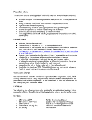 The BBC is seeking tenders from independent production companies to produce Gardeners' Question Time for three years from August 2012 to July 2015. The popular radio program is recorded weekly at different venues and involves a panel of experts answering questions from an audience of gardening enthusiasts. Applicants should demonstrate experience in factual radio production, compliance management, and outside broadcasting. They will also need ideas for developing the format while maintaining its core values as well as utilizing digital media. The tender will be assessed based on production capabilities, editorial vision, understanding of the audience, and commercial exploitation opportunities.