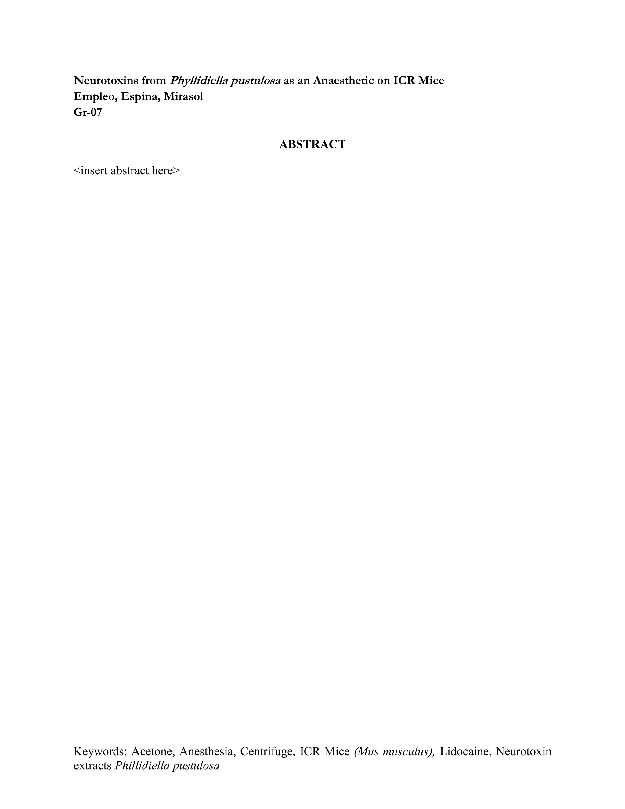 The document discusses an experiment where neurotoxins were extracted from the sea slug Phyllidiella pustulosa and tested as an anesthetic on mice. The neurotoxins were extracted using acetone and centrifugation. The effectiveness of the neurotoxins as an anesthetic was compared to lidocaine by measuring induction and recovery times when administered to mice.