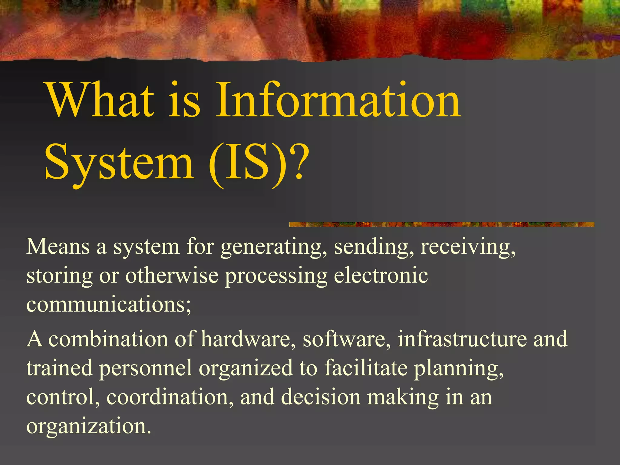 This document provides an introduction to information systems. It defines an information system as a combination of hardware, software, infrastructure, and personnel used to generate, process, store, and transmit electronic data to facilitate planning, control, and decision making within an organization. The document then discusses the history of information systems, highlighting the roles of mainframe computers, personal computers, networks, and the internet. It also outlines the importance of information systems in communication, operations, decision making, and record keeping for organizations. Finally, it briefly describes common types of information systems like transaction processing systems, management information systems, and decision support systems.