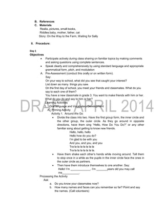 The lesson plan is for Grade 3 students and covers a week of instruction. It focuses on oral language skills, reading comprehension, writing riddles, and grammar. The plan includes daily objectives, learning activities, and assessments. Some key points: