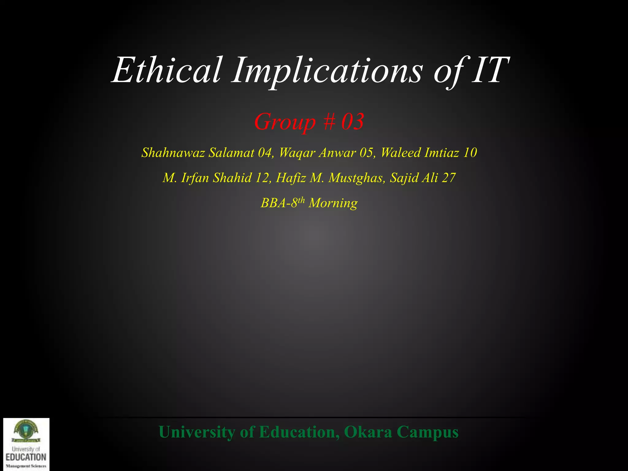 This document discusses the ethical implications of information technology. It begins by stating that firms have an obligation to establish an ethical culture through a corporate credo and ethics programs. It also notes that computer ethics are important because society has perceptions and fears related to computer use. The document then defines the differences between morals, ethics, and laws. It discusses reasons for computer ethics, including the logical malleability of computers, their ability to transform processes, and the invisibility of their internal operations. The document also outlines four basic social rights related to information: privacy, accuracy, property, and accessibility. It concludes by discussing how companies can establish ethics in IT through codes of ethics and educational programs.