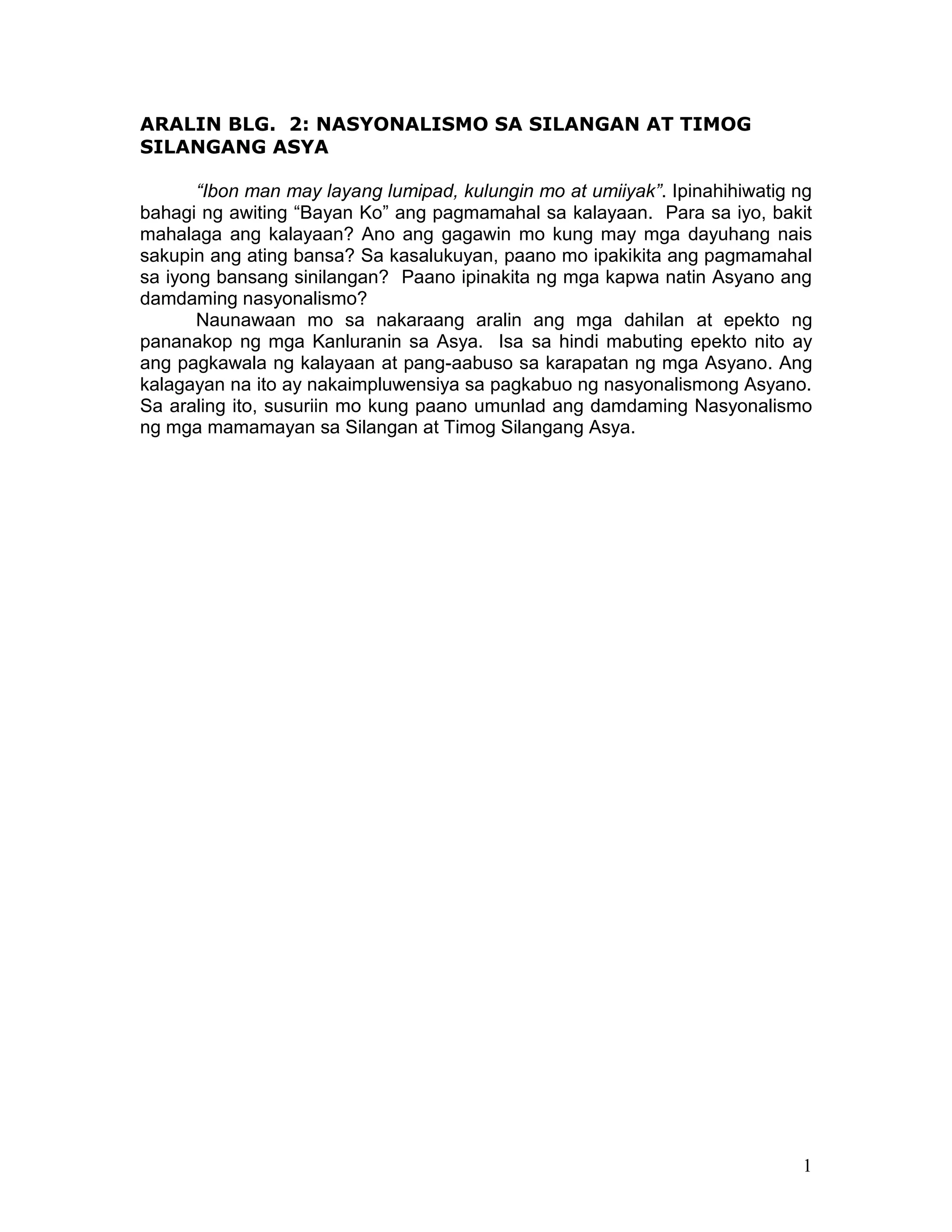 Ang aralin ay tumatalakay sa pag-unlad ng nasyonalismo sa Silangan at Timog Silangang Asya, na naiimpluwensyahan ng mga kolonyalismo at imperyalismo ng mga Kanluranin. Tinatalakay din nito ang mga pangunahing kilusan at rebelyon sa Tsina, kabilang ang Rebelyong Taiping at Rebelyong Boxer, na nagbigay-diin sa pagnanais ng mga Asyano na makamit ang kalayaan at karapatan. Sa kabuuan, ang mga kaganapang ito ay nag-ambag sa pag-unlad ng nasyonalismong Asyano sa harap ng pananakop.