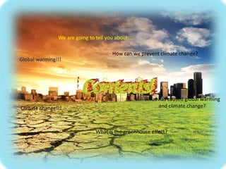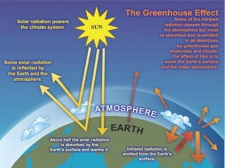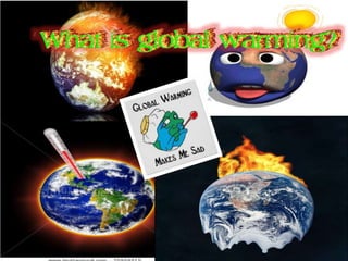The document discusses global warming and climate change, explaining that global warming is caused by increased CO2 in the atmosphere from human activities like burning fossil fuels. This greenhouse effect is warming the planet and causing changes to the climate over long periods of time, leading to more extreme weather events and putting species at risk. The document will further explain the greenhouse effect and how reducing CO2 emissions from vehicles, energy usage, and fossil fuels can help prevent additional climate change.