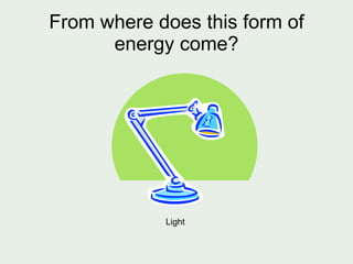 The document discusses different forms of energy and their sources. Light energy comes from the sun, outlets get energy from electric wires, which get it from power plants. Power plants get energy from coal, and coal originally gets its energy from the sun, as do plants. The sun creates its own energy and is the main source of all other energy sources on Earth.