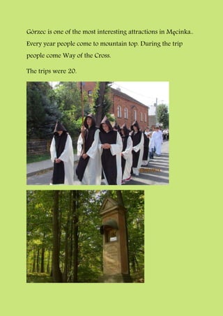 Górzec is one of the most interesting attractions in Męcinka, located 5.6 km from the town center. It draws tourists each year for its Way of the Cross pilgrimages and views of the surrounding landscape from the top. Historians believe the site was originally used for pagan worship before a small castle was built there during the Middle Ages when it was owned by the Cistercian order. Górzec has long been important to Męcinka for its history and traditions.