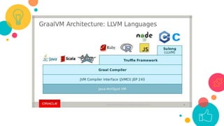 GraalVM is an ecosystem and runtime that provides performance advantages to JVM languages like Java, Scala, Groovy, and Kotlin as well as other languages. It includes a just-in-time compiler called Graal that improves efficiency, polyglot APIs for combining languages, and SDK for embedding languages and creating native images. Installation can be done with the JDK which includes Graal starting with JDK 9, or by directly downloading GraalVM from Oracle's website.
