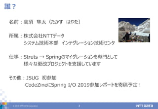 DATA Corporation 2 名前:高須 隼太(たかす はやた) 所属:株式会社NTTデータ システム技術本部 インテグレーション技術センタ 仕事:Struts → Springのマイグレーションを専門として 様々な更改プロジェクトを支援しています その他:JSUG 初参加 CodeZineにSpring I/O 2019参加レポートを寄稿予定! 誰?