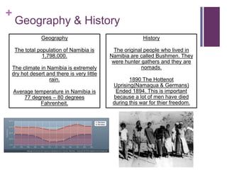 The document summarizes key facts about Namibia, including its population, climate, and history of colonial rule and conflict. It then discusses the ongoing Caprivi Conflict between the Caprivi Liberation Army and the Namibian government over establishing an independent Caprivi state. While possible solutions include negotiations between the groups or regional support, the document notes there is no final solution yet and the conflict continues without clear boundaries.