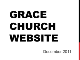 This document discusses plans to develop a new website for Grace Church to help the church grow. It recommends using the free online Weebly website builder and hosting. The draft Grace Church website is shown and key features like easy navigation, photos, service schedule and events are recommended. Integrating the website with Facebook, blogs, email newsletters and PayPal donations is also suggested. Next steps include prioritizing elements, setting a timeline and getting feedback by reviewing other church websites. The overall goal is to make the website engaging and informative so more people will learn about Christ.