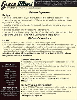 Grace Altieri has extensive experience in design, editing, camera operation, and audio configuration for film, television, and web projects. She has created graphics, layouts, and advertisements for various clients. As an editor, she has organized raw footage, determined effects, and produced final products. Her camera experience includes operating television and motion picture cameras to record scenes. She also has experience setting up specialty audio and camera configurations.