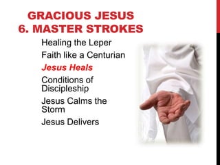 Jesus heals various illnesses and conditions. The presentation discusses Jesus healing Peter's mother-in-law of a fever, exorcising demons, and healing all who were sick. It explores the routine of Jesus seeing and healing both physically and spiritually. Reasons for healing included bearing our sins and living righteously. Responses to healing included serving Jesus, leaving him, thanking him, and seeking him. The greatest sickness is sin, and physical sickness sometimes helps cure sinful habits. Maintaining a focus on healing souls rather than just bodies is important.