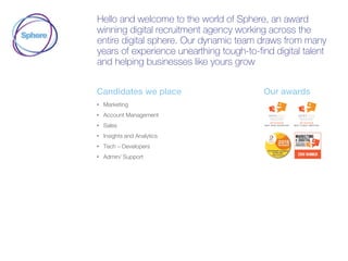 Sphere is an award-winning digital recruitment agency specializing in marketing technology and analytics, providing services for businesses looking to hire graduates. They offer graduate group assessments to streamline the hiring process and have demonstrated a high success rate in placements. Clients have praised Sphere for their attentive service and effective candidate matching.