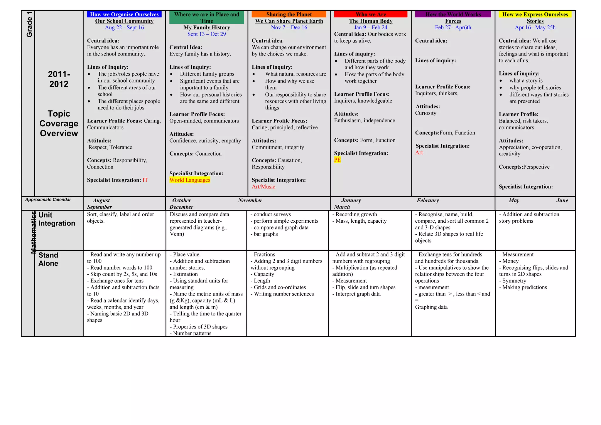 This document provides an overview of the Grade 1 curriculum for the 2011-2012 school year. It is organized by units of inquiry covering 6 transdisciplinary themes: Who We Are, Where We Are in Place and Time, How We Express Ourselves, How the World Works, Sharing the Planet, and How We Organize Ourselves.