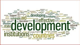 The document discusses various topics related to development including goals of development, national development, comparing development levels between countries, human development, and measuring development. It provides definitions of development and sustainable development. It also compares India's development to its neighboring countries based on metrics like per capita income, life expectancy, literacy rate, and HDI ranking.