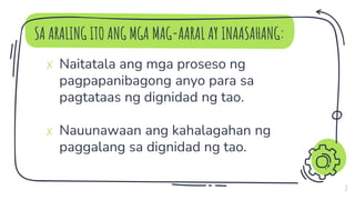Ang dokumento ay tungkol sa kahalagahan ng dignidad ng tao, na nag-ugat sa salitang Latin na 'dignitas'. Ang mga tao, anuman ang kanilang katayuan, ay may karapatan sa paggalang at pagpapahalaga, at ang pag-angat sa dignidad ay isang panghabambuhay na proseso na kinabibilangan ng tatlong hakbangin. Binibigyang-diin din nito na ang paggalang sa dignidad ng bawat isa ay mahalaga sa pagtataguyod ng isang mas mahusay na lipunan.