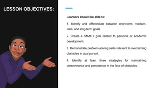 The document outlines goal-setting strategies for 11th-grade learners, emphasizing the differentiation between short-term, medium-term, and long-term goals. It introduces the SMART criteria for effective goal creation and provides examples and steps for setting and achieving personal or academic goals, including strategies for problem-solving and maintaining perseverance. Additionally, it highlights the importance of both perseverance and persistence in overcoming obstacles encountered during goal pursuit.
