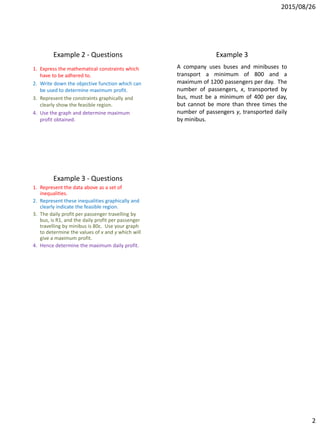 This document provides three examples of using linear programming to optimize objectives like minimizing costs or maximizing profits. The first example involves determining the optimal number of artisans and apprentices a furniture factory should employ to minimize wages while delivering at least 90 units per week. The second example involves determining the optimal amounts of two product mixtures a sweet factory should make to maximize daily profit. The third example involves determining the optimal number of passengers a company should transport by bus and minibus each day to maximize daily profit.