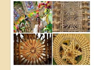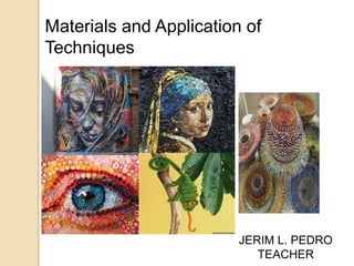 The document discusses several traditional Philippine art forms and crafts that utilize locally available materials. It describes the materials and techniques used in singkaban bamboo carving, puni leaf weaving, pastillas wrapper design known as pabalat, taka paper mache craft from Paete, Laguna, pottery making in Pasig, and embroidery from Taal and Lumban, Laguna. The document aims to preserve these disappearing local art forms and educate new generations about traditional Philippine materials and application techniques.