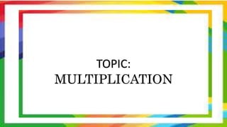 The document discusses various multiplication concepts and problems. It covers partitioning shapes into parts and expressing sets as multiplication problems. Students are asked to use a number line to solve multiplication equations, understand multiplying by 10s, and determine if answers are reasonable based on multiplication rules. Challenge problems involve calculating earnings, saving amounts over time, and sharing original amounts given certain transfers between parties.