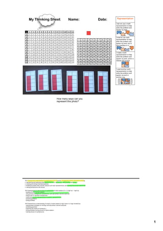 The document is a student's thinking sheet for practicing multiplication and division skills up to 5x5. It includes examples of representing multiplication using repeated addition, arrays, and relating it to division. Word problems are provided to apply the skills, and the student's work and explanations are documented. References and credits are listed at the end.