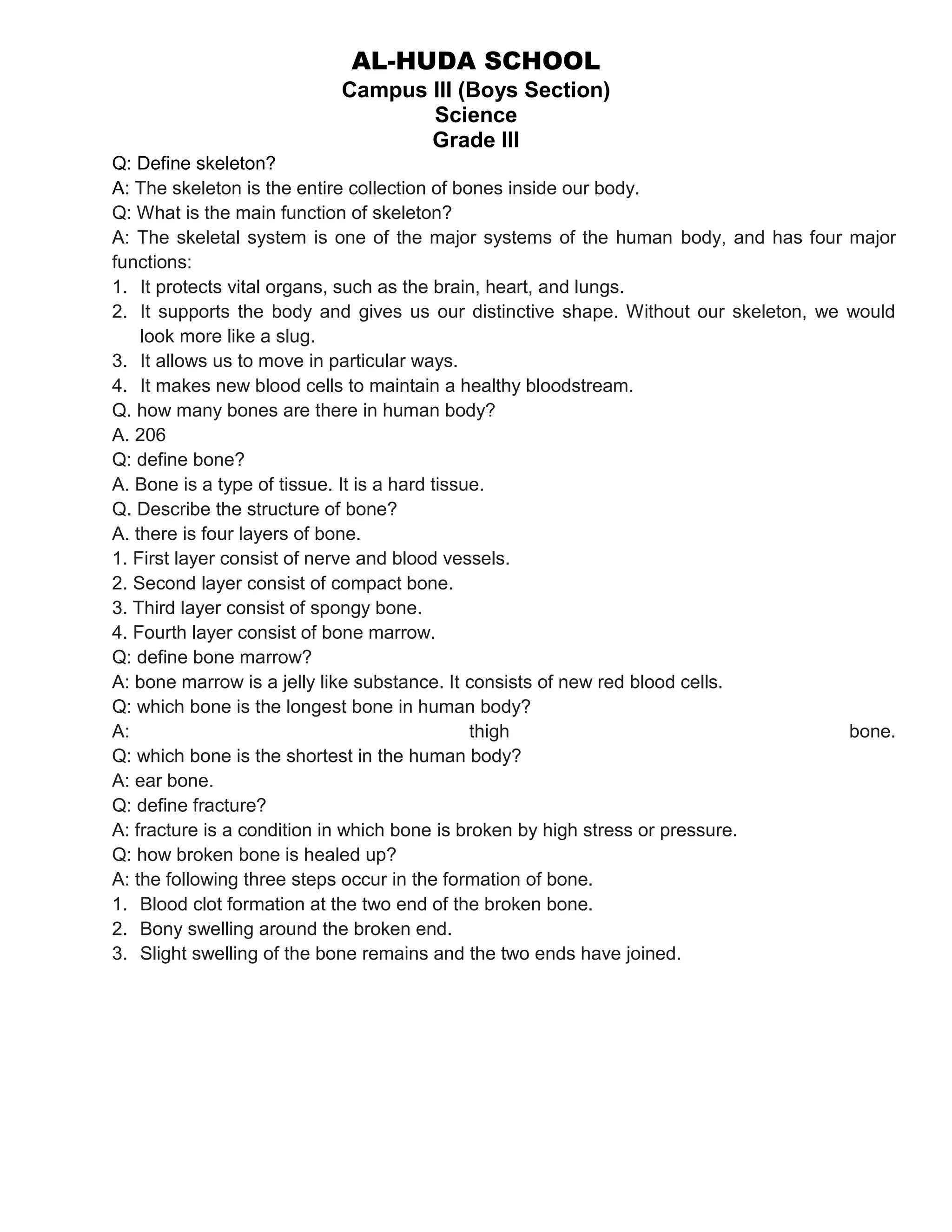 The skeleton has four main functions: protecting organs, supporting the body, allowing movement, and producing blood cells. There are 206 bones in the human body. Bone is made of four layers - an outer layer of nerve and blood vessels, a dense inner layer of compact bone, a spongy middle layer, and an inner layer of bone marrow which produces red blood cells. The longest bone is the thigh bone and the shortest is the ear bone. A fracture is a broken bone that heals through the formation of a blood clot at the break, bony swelling around the ends, and rejoining of the two broken pieces.